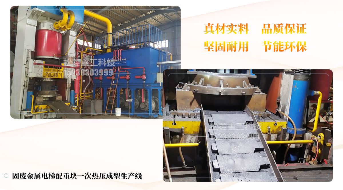 固廢金屬電梯配重塊一次熱壓成型生產(chǎn)線對鋼渣、粒子鋼、鋼屑、金屬破碎料、鋸床料、磨床料、生鐵銷、鐵精粉、氧化鐵皮、印尼紅土鎳礦等這些物料都能輕松達到不錯的展示效果。